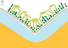 Les fibres du ligament alvéolo-dentaire s'ancrent sur le cément d'une part et dans l'os alvéolaire d'autre part assurant ainsi la fixation des dents à celui-ci. Grâce à l'élasticité de ces fibres qui jouent un rôle amortisseur, les dents peuvent effectuer de légers mouvements, stimulant en permanence le tissu osseux environnant sous l'effet de la pression masticatoire. |